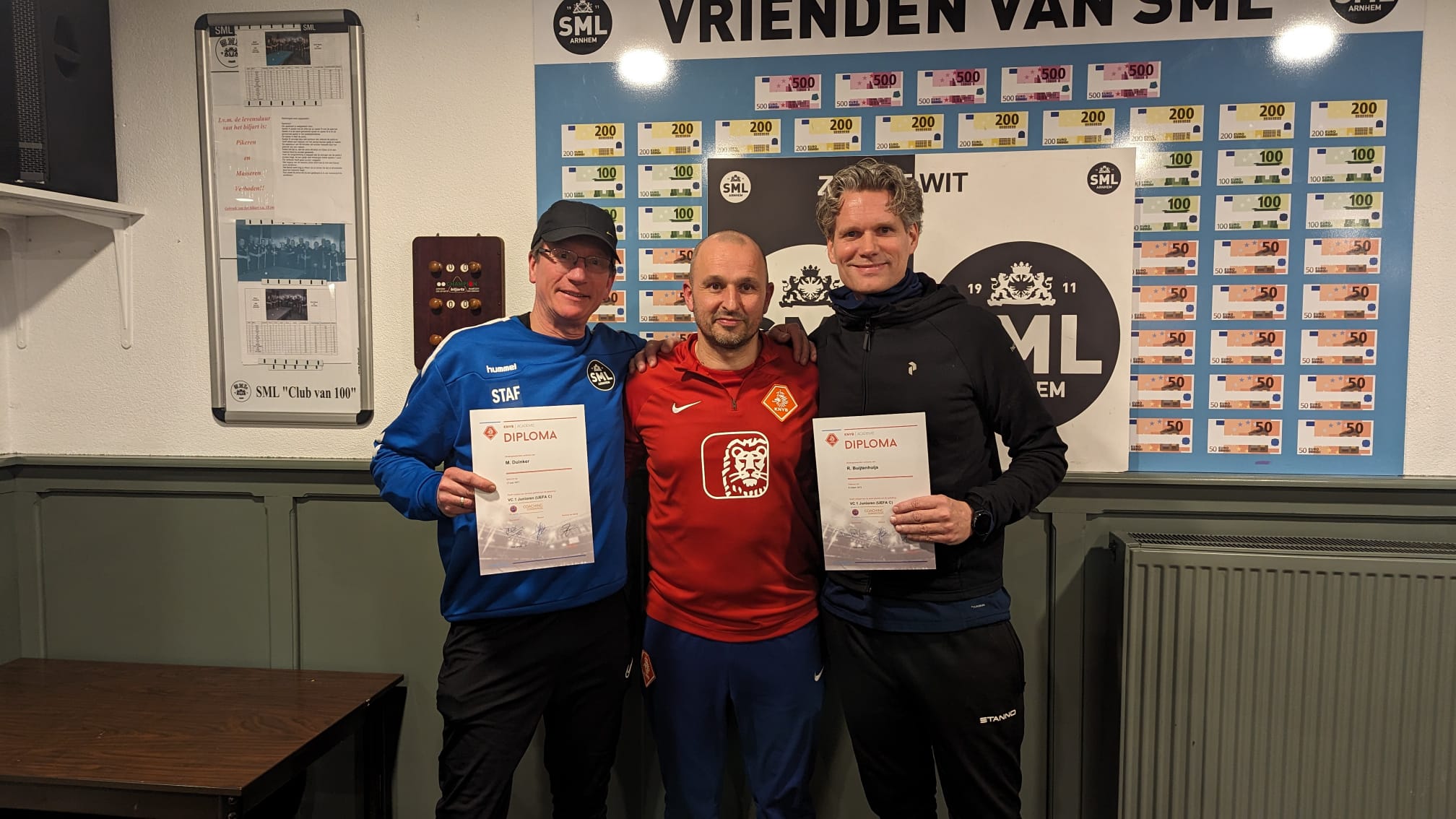 Samen met coaches van andere clubs in de regio volgden zij succesvol de KNVB-cursus die bij SML werd gegeven.
